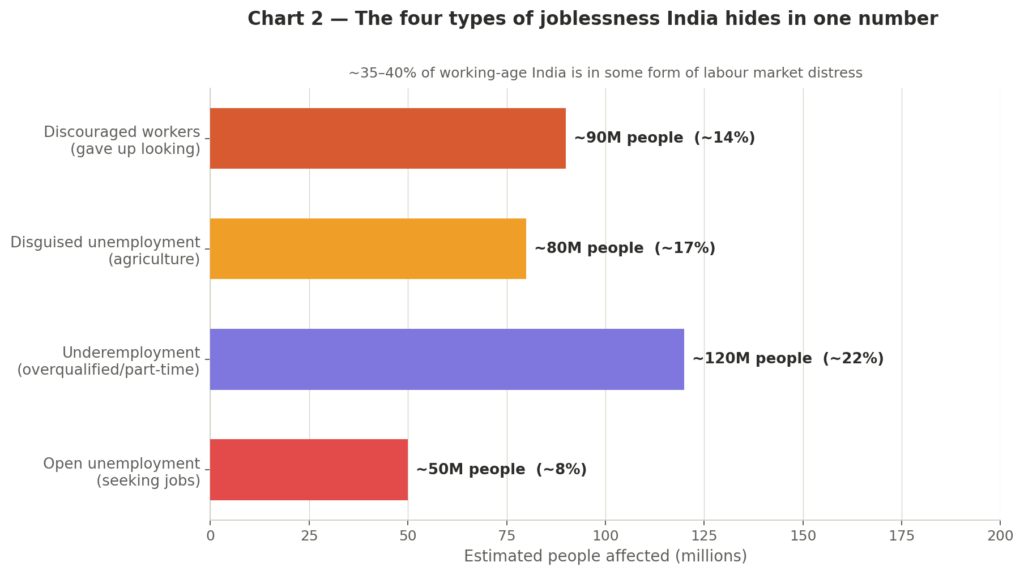 “If you count open unemployment, underemployment, disguised unemployment, and discouraged workers together, ~35–40% of India’s working-age population is in labour market distress.”