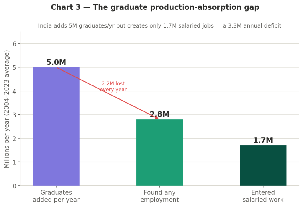 The current trajectory is concerning. India’s education system is producing 5 million graduates per year into an economy that can absorb only 1.7 million into salaried work — a structural deficit of 3.3 million new frustrated graduates every single year. Each cohort adds to a growing pool of educated, underemployed, psychologically stressed young people who rationally spend their most productive years chasing government jobs that statistically can accommodate less than 0.1% of aspirants.