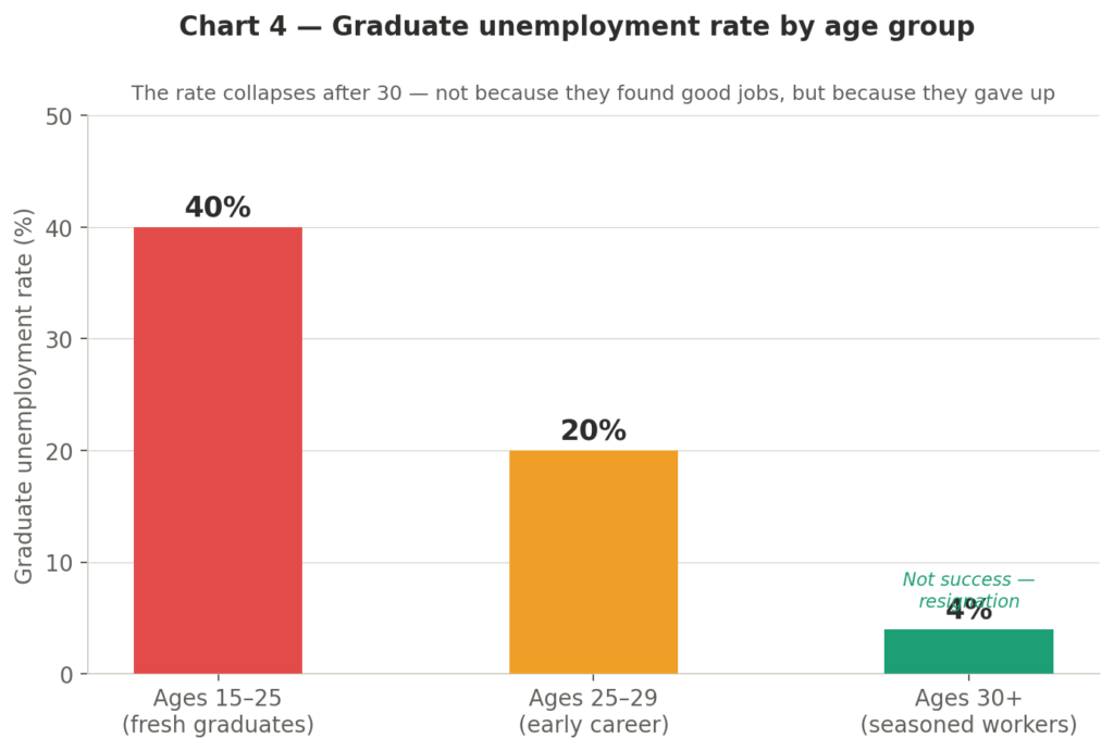 The finding is stark: 11 million out of 63 million graduates aged 20–29 are unemployed as of 2023. That is 17.5% of all graduates in that age bracket — but the breakdown by sub-cohort is even more alarming. Among those aged 15–25, the graduate unemployment rate is approximately 40%. Among those aged 25–29, it is approximately 20%. Only after age 30 does the rate fall below 4% — and critically, this is not because graduates find good jobs after 30. It is because they stop looking and accept whatever is available, however far below their qualification level.