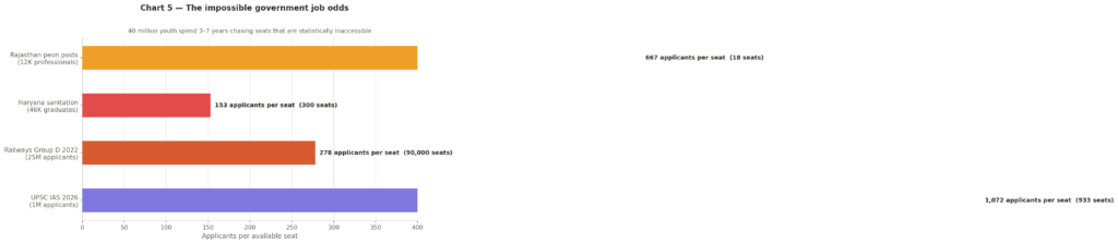 The odds are prohibitive. The UPSC Civil Services Examination 2026 has 933 available seats against approximately 1 million applicants. In 2022, 25 million youth applied for 90,000 Railways Group D positions. In 2024, over 46,000 graduates applied for sanitation jobs in Haryana — clearly overqualified — and 12,000 professionals competed for 18 peon posts in Rajasthan. These numbers reflect not desperation but rational calculation: a government job provides lifetime security, pension, social status, and protection from automation. Private sector jobs increasingly offer none of these things.