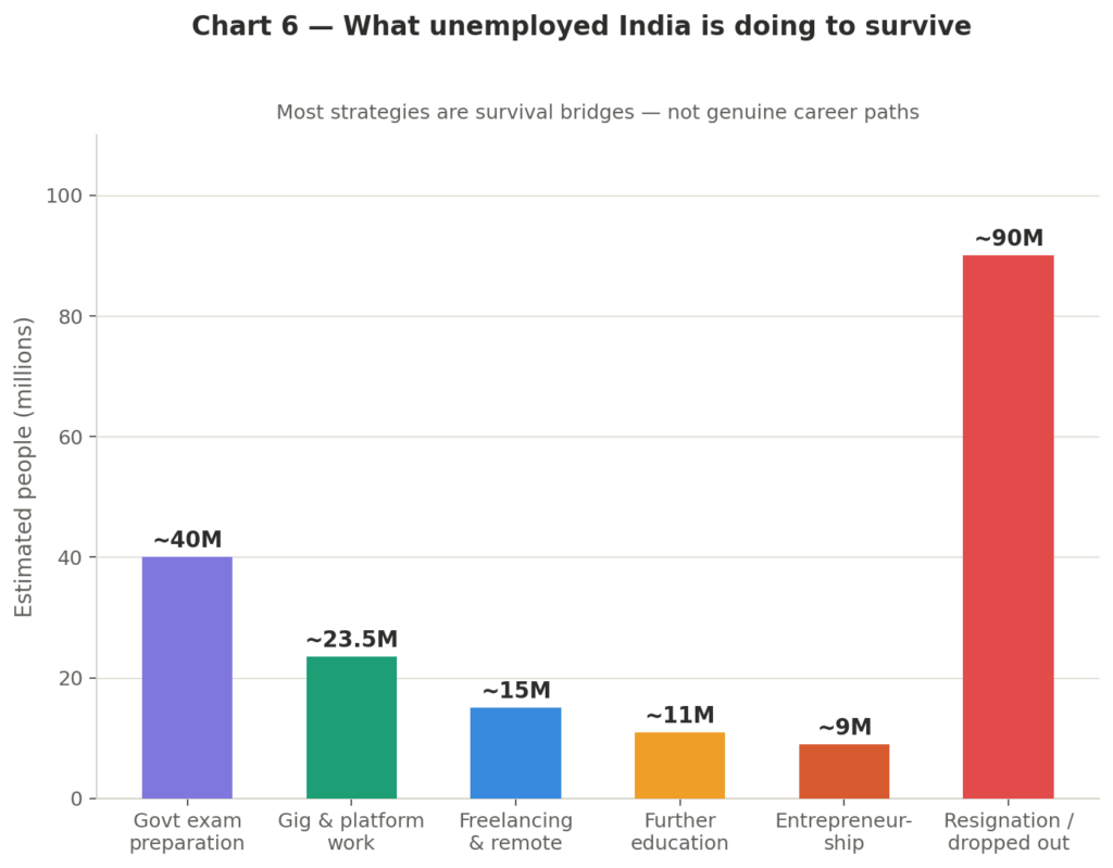 The question that rarely gets asked alongside the unemployment statistics is this: what are these people actually doing while they are “unemployed”? The answer reveals six distinct survival strategies — each rational given the circumstances, each with its own scale and implications for the economy.