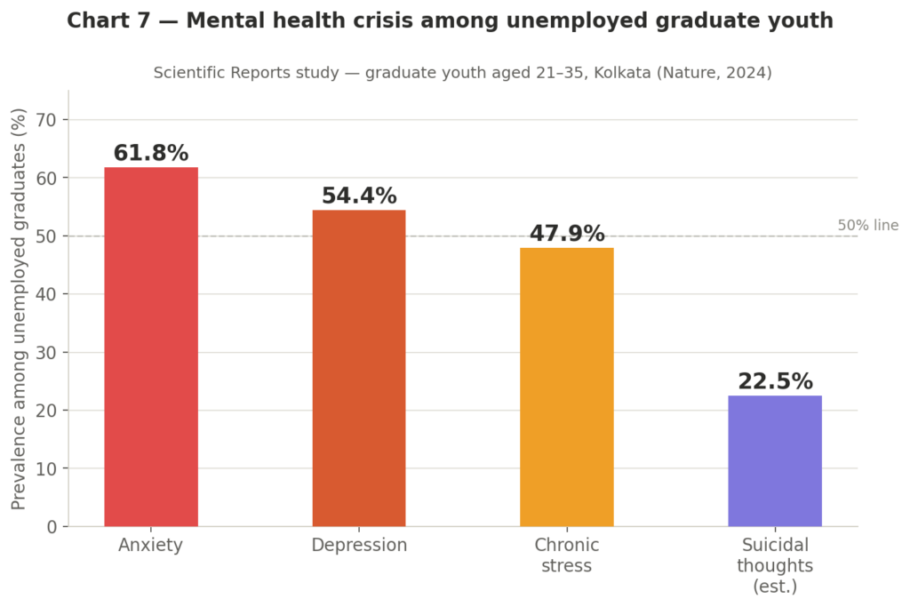 A peer-reviewed study published in Nature Scientific Reports (2024), focused on higher-educated migrant graduate youth aged 21–35 in Kolkata, found overall prevalence rates of 54.4% for depression, 61.8% for anxiety, and 47.9% for chronic stress among unemployed graduates — significantly higher than among their employed counterparts. The research notes that higher education leads paradoxically to higher unemployment risk, and that the resulting gap between expectation and reality is psychologically more damaging than unemployment among those with lower educational attainment.