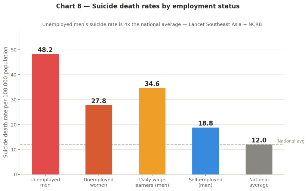 The most severe manifestation of this psychological crisis is captured in suicide mortality data. Research published in The Lancet Regional Health — Southeast Asia found that unemployed men have a suicide death rate (SDR) of 48.2 per 100,000 population, and unemployed women an SDR of 27.8 — both significantly elevated above the national average. Daily wage earner suicides increased 170.7% between 2014 and 2021.