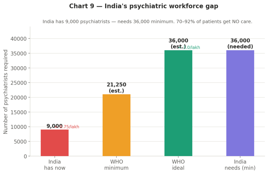 The psychiatric workforce gap is the most glaring structural failure. India has 9,000 practising psychiatrists against a minimum requirement of 36,000 — a 75% deficit. The psychiatrist density of 0.75 per 100,000 population is less than half the WHO minimum standard of 1.7, and one-quarter of the WHO ideal of 3.0. Beyond psychiatrists, India has only 4,309 clinical psychologists and 801 rehabilitation social workers — among the world’s largest per-capita shortfalls.